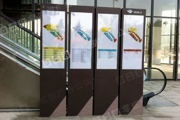 置于入口、廣場(chǎng)或電梯口處,起著指示導(dǎo)向及宣傳企業(yè)形象的作用,其色彩一般采用暖調(diào)的紅或桔黃,給顧客以親切溫暖的感覺,材料近年來則多運(yùn)用弧形的鋁型材以營(yíng)造時(shí)尚高雅的氛圍。