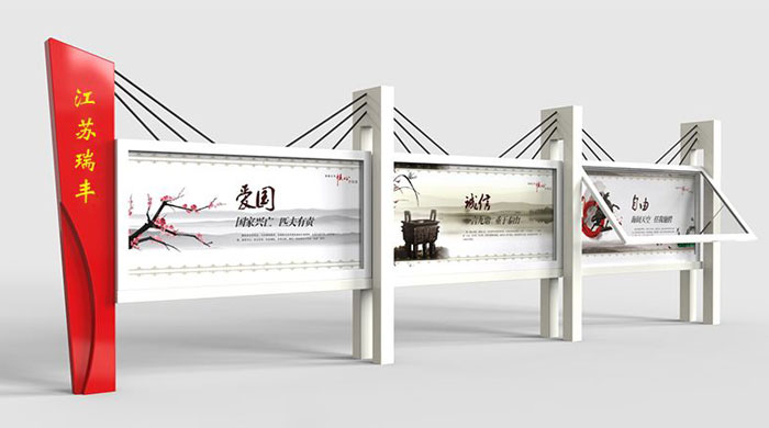 其次,還要看宣傳欄安裝的地點(diǎn)。 不同的地點(diǎn)所需要的宣傳欄設(shè)計(jì)方案不同,如果安裝在戶外,精神堡壘需要考慮宣傳欄的制作材料,宣傳欄結(jié)構(gòu),還要考慮雨雪天氣腐蝕,外部風(fēng)沙影響等,一般采用玻璃頂棚,通過(guò)鍍鋅板,不銹鋼外部框架與玻璃之間的搭配,能夠有效防止宣傳欄受到惡劣天氣影響,如果是室內(nèi)懸掛,則需要考慮室內(nèi)布置位置,還要考慮宣傳欄所涉及的內(nèi)容,針對(duì)內(nèi)部管理信息的宣傳,可以采取墻面框架懸掛的模式,還可以采取X展架擺放的模式,來(lái)提升單位整體形象。