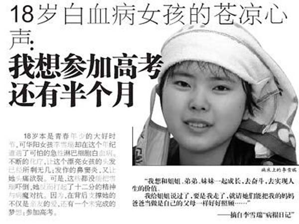 參加高考是雪瑞的最大夢(mèng)想。雪瑞說(shuō)“高考,對(duì)于十年寒窗苦讀的我是一個(gè)最好的檢驗(yàn);高考,對(duì)于身患白血病的我來(lái)說(shuō),不能像其他學(xué)生一樣坐在考場(chǎng)完成;高考,對(duì)于生命存續(xù)間的我多么重要,如果不能參加高考,這是我的遺憾。” 2011年5月,雙流縣招辦得知雪瑞的情況后,主動(dòng)同雪瑞就讀的學(xué)校-- 雙流縣藝術(shù)體育實(shí)驗(yàn)中學(xué)取得聯(lián)系,銜接病房高考事宜。出于雪瑞的身體等多方面考慮,最終雪瑞未能如愿參加高考。