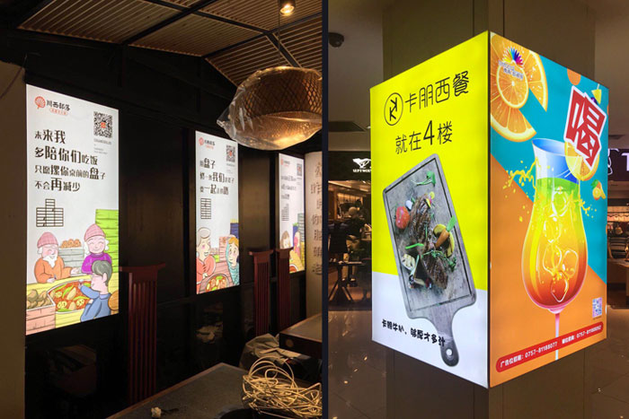 散布燈箱,其屏幕一般采用無屏刮板布,強度高,延展性好,柔韌性強,吸墨性強,不易褪色,具有抗氧化,耐酸堿,耐嚴寒等優(yōu)點。。一般在戶外使用。
