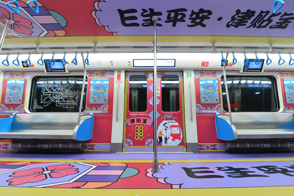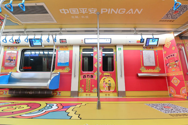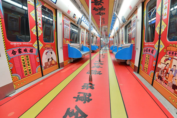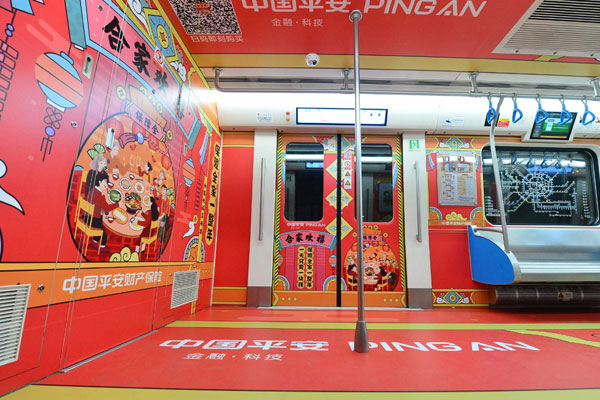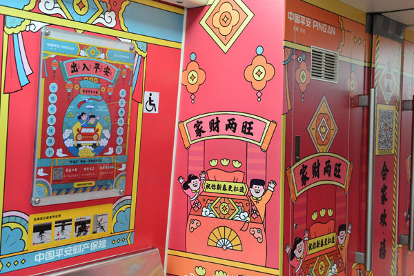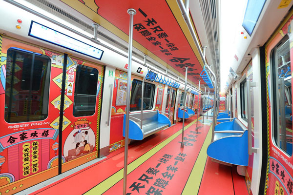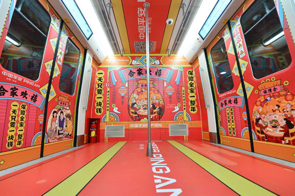 此次主題列車(chē)共6節(jié)車(chē)廂,圍繞四款保險(xiǎn)產(chǎn)品進(jìn)行設(shè)計(jì),整體風(fēng)格偏“國(guó)潮”復(fù)古風(fēng),以紅、橘為主色調(diào),藍(lán)、黃等明亮色點(diǎn)綴其間,畫(huà)面中運(yùn)用了祥云、燈籠、鞭炮等大量中國(guó)元素,輔佐以活潑的漫畫(huà)風(fēng)格,整體呈現(xiàn)出喜慶歡樂(lè)的氛圍。