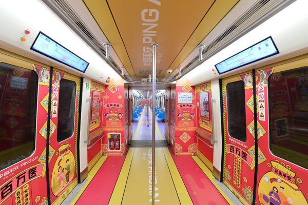 “平安號(hào)”主題列車(chē)圍繞平安產(chǎn)險(xiǎn)四川分公司推出的四款爆款保險(xiǎn)產(chǎn)品展開(kāi)設(shè)計(jì),第1節(jié)與第6節(jié)車(chē)廂主推“合家歡·禧”;第2節(jié)車(chē)廂與第5節(jié)車(chē)廂主打“平安行”;第3節(jié)車(chē)廂呈現(xiàn)的是“生平安·津貼寶”;第4節(jié)車(chē)廂為“E生平安·百萬(wàn)醫(yī)”。