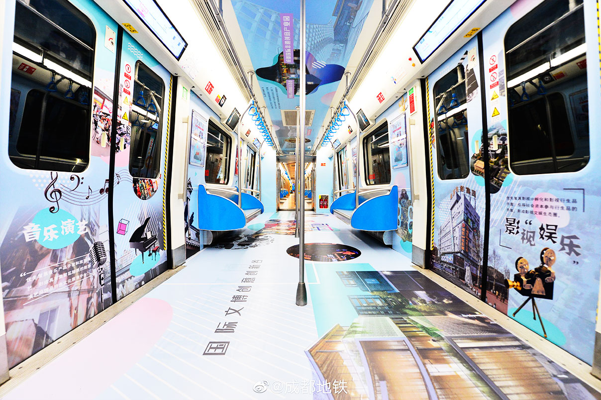 主題列車(chē)途經(jīng)火車(chē)北站、火車(chē)南站等交通樞紐站,以及孵化園、天府三街、天府五街等青年“蓉漂”重要聚集地,采用收集網(wǎng)友留言的思路“刷”進(jìn)車(chē)廂。通過(guò)在成都地鐵官方微博和微信上收集“蓉漂”選擇成都、愛(ài)上成都、扎根成都的原因,主題列車(chē)選擇其中一個(gè),一個(gè)是步行,另一個(gè)是主題列車(chē)中的步行溫馨信息。