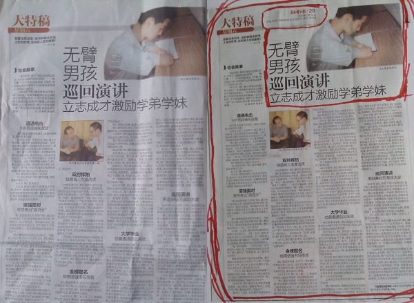 2012年7月14日星期六,華西都市報(bào)第28版大特稿刊登了《無臂男孩巡回演講立志成才激勵(lì)學(xué)弟學(xué)妹》的文章。在2003年高考完畢,熊仁汀(原名熊仁葛)就被華西都市報(bào)、新華社、成都商報(bào)、成都晚報(bào)、香港文匯報(bào)等采訪報(bào)道了他在9歲時(shí)遭遇電擊,痛失雙臂后,通過父母、老師、同學(xué)的幫助和自己的努力,戰(zhàn)勝重重困難,重新堅(jiān)強(qiáng)地面對(duì)生活和學(xué)習(xí),靠著堅(jiān)韌的毅力克服了一般人不能克服的種種困難,以高出當(dāng)年本科錄取線51分的好成績(jī)考入了西南石油大學(xué),激勵(lì)了無數(shù)的學(xué)弟學(xué)妹去實(shí)現(xiàn)他們的大學(xué)夢(mèng)想和人生追求!