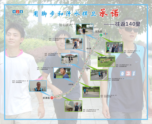 2012年8月12日,028廣告公司業(yè)務(wù)部用實(shí)際行動(dòng)兌現(xiàn)了他們的承諾,7月份,他們計(jì)劃要完成的銷(xiāo)售和收款任務(wù),沒(méi)有按時(shí)完成,根據(jù)當(dāng)初的承諾,他們要做出經(jīng)濟(jì)捐款,然后從雙流步行到新津一個(gè)來(lái)回。今天,他們用實(shí)際行動(dòng)證明了028男子漢的一諾千金——對(duì)于承諾了的事情,就一定要辦到!哪怕是苦果,也要自己吃下去!