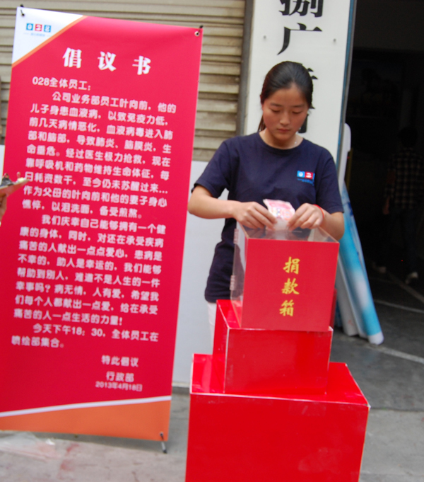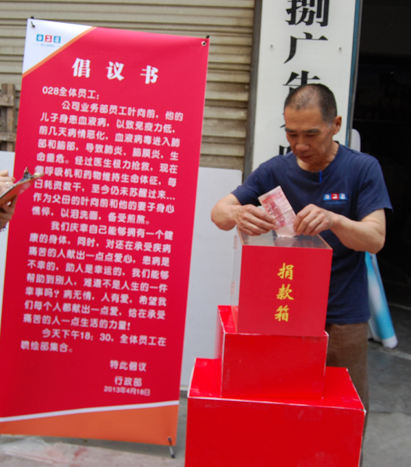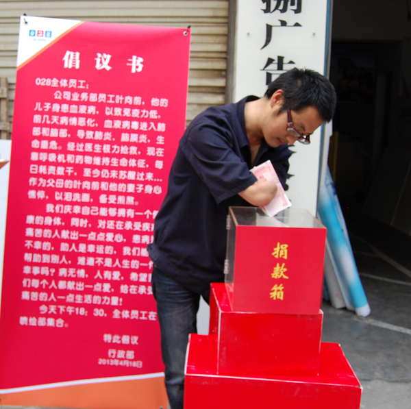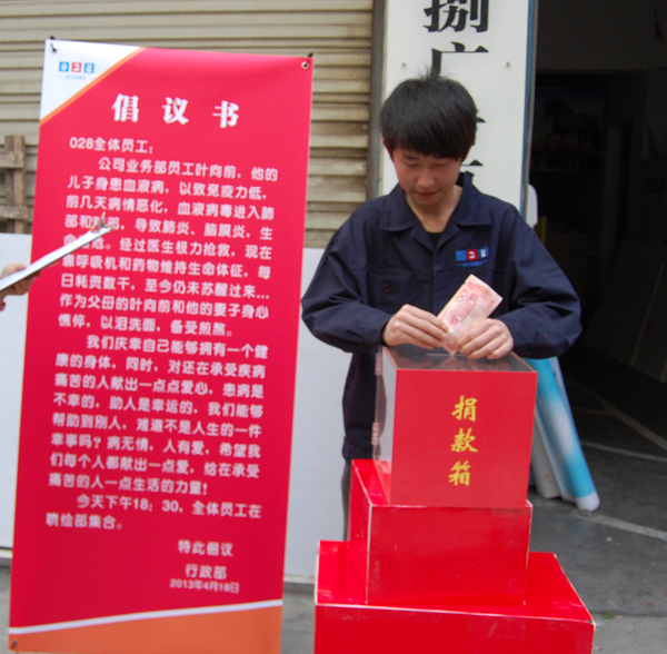 公司領(lǐng)導(dǎo)得知這一消息后,為他感到非常擔(dān)心,總經(jīng)理汪平江親自前去看望,并送上慰問金。4月18日,028董事會倡議進(jìn)行愛心捐款,下午18:30,全體028員工在公司門口集合,排隊依次進(jìn)行捐款,一份份的真情,愛的力量在這一刻匯流成河……