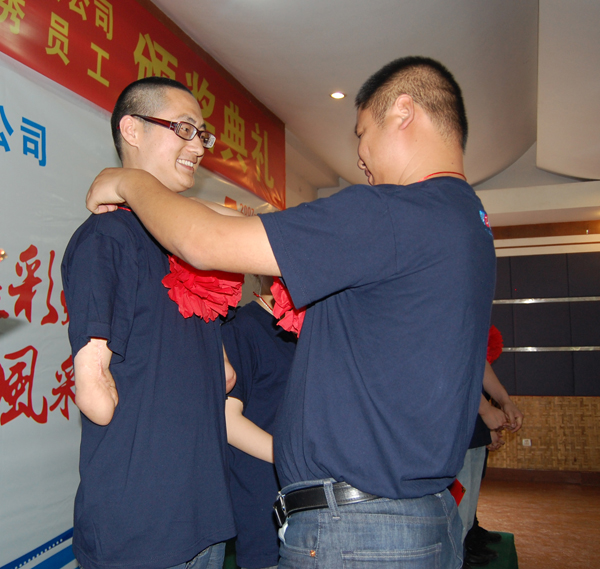 公司總經(jīng)理親自為優(yōu)秀員工帶上大紅花以表示感謝,他為公司付出青春和汗水。