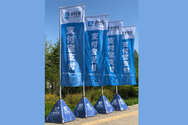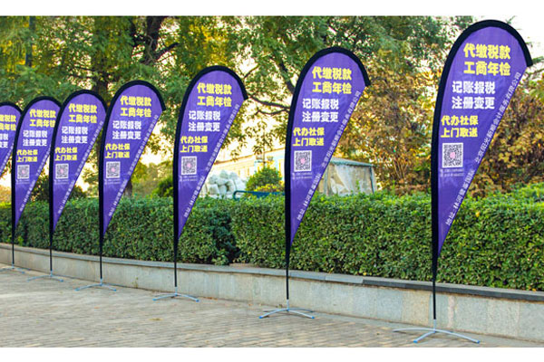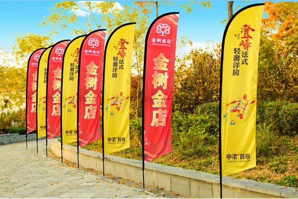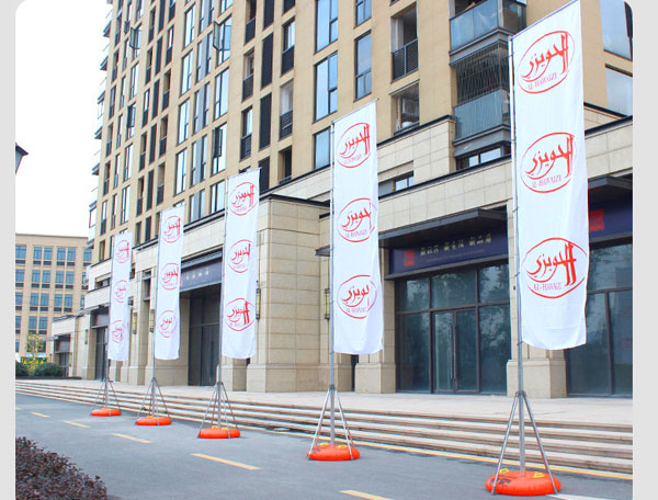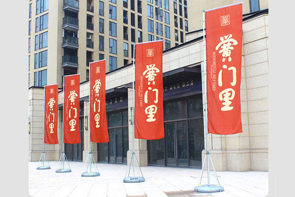 注水旗/水柱道旗制作 注水旗顧名思義就是可以注水的。通常有3米、5米、7米三種不同高度的旗桿。三米注水旗桿旗面尺寸為06*1.6m,五米注水旗桿旗面尺寸為1-2m*3.5m,七米注水旗桿旗面尺寸為1-2m*5.5m。