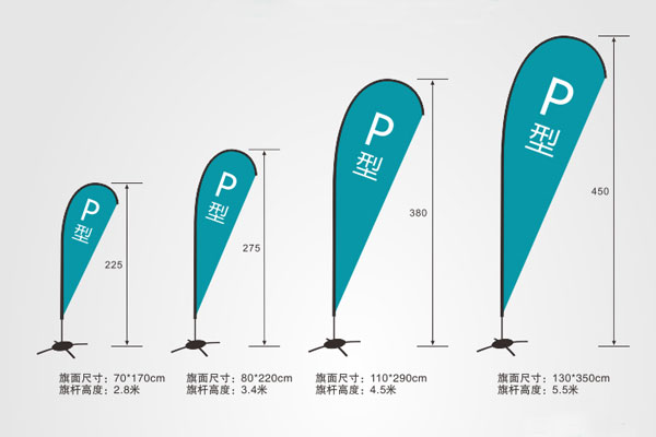 羽毛旗/P型旗有2.8米、3.4米、4.5米、5.5米四種不同高度的旗桿。2.8米羽毛旗旗面尺寸0.7*1.7m,3.4米羽毛旗旗面尺寸0.8*2.2m,4.5米羽毛旗旗面尺寸1.1*2.9m,5.5米羽毛旗旗面尺寸1.3*3.5米。