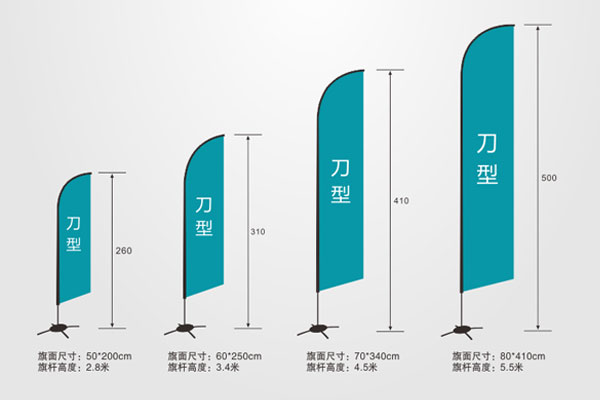 刀旗有2.8米、3.4米、4.5米、5.5米四種不同高度的旗桿。2.8米羽毛旗旗面尺寸0.5*2m,3.4米羽毛旗旗面尺寸0.6*2.5m,4.5米羽毛旗旗面尺寸0.7*3.4m,5.5米羽毛旗旗面尺寸08*4.1米。