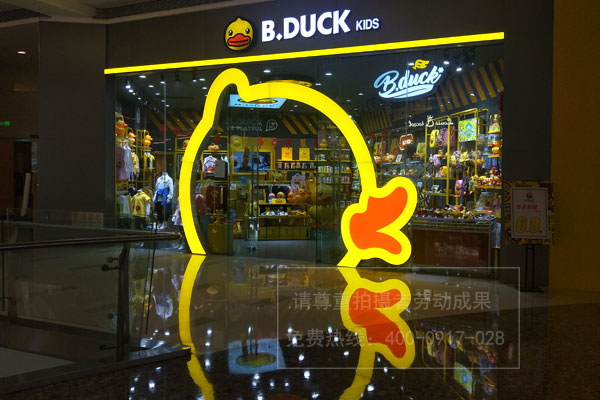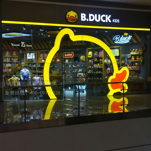 B.Duck kids小黃鴨因?yàn)楫a(chǎn)品超可愛所以受到廣大客戶的喜愛,所以在很多的商場都會有兒童潮牌實(shí)體店的入駐,其門店裝飾、店面招牌設(shè)計門頭發(fā)光字制作方面都特別的新穎。