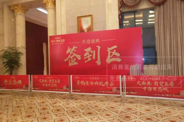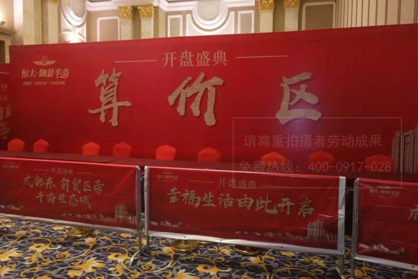 恒大地產(chǎn)御景半島開盤盛典算價(jià)區(qū)背景墻桁架搭建/路欄噴繪畫面制作安裝