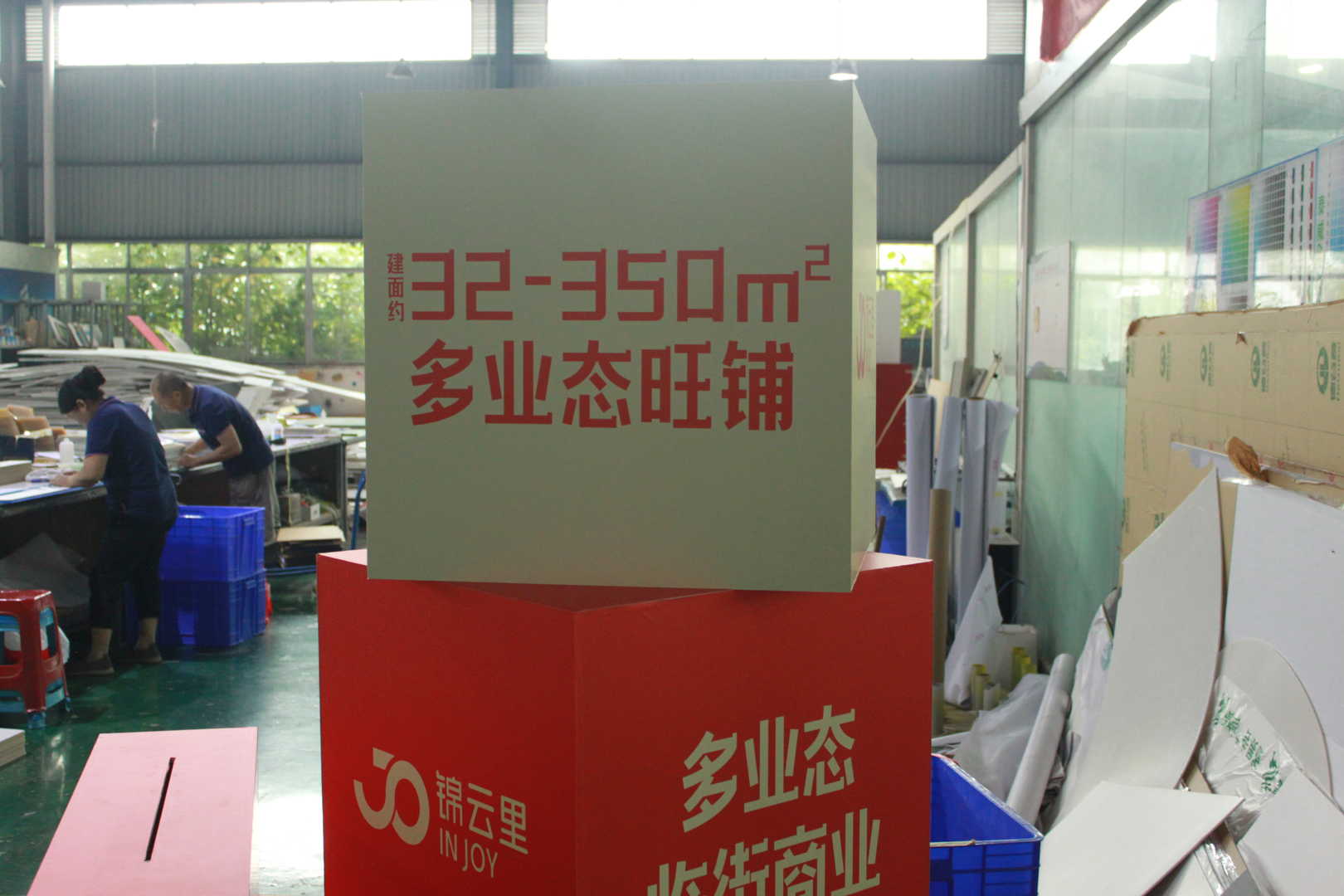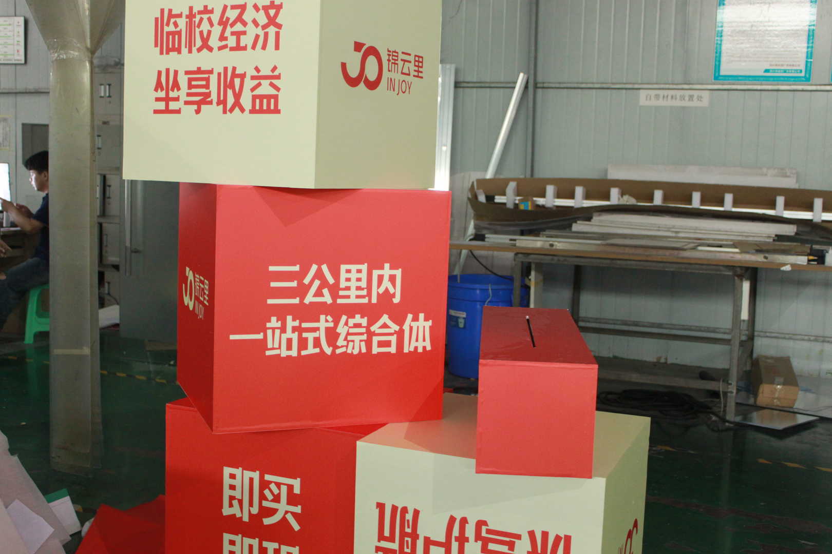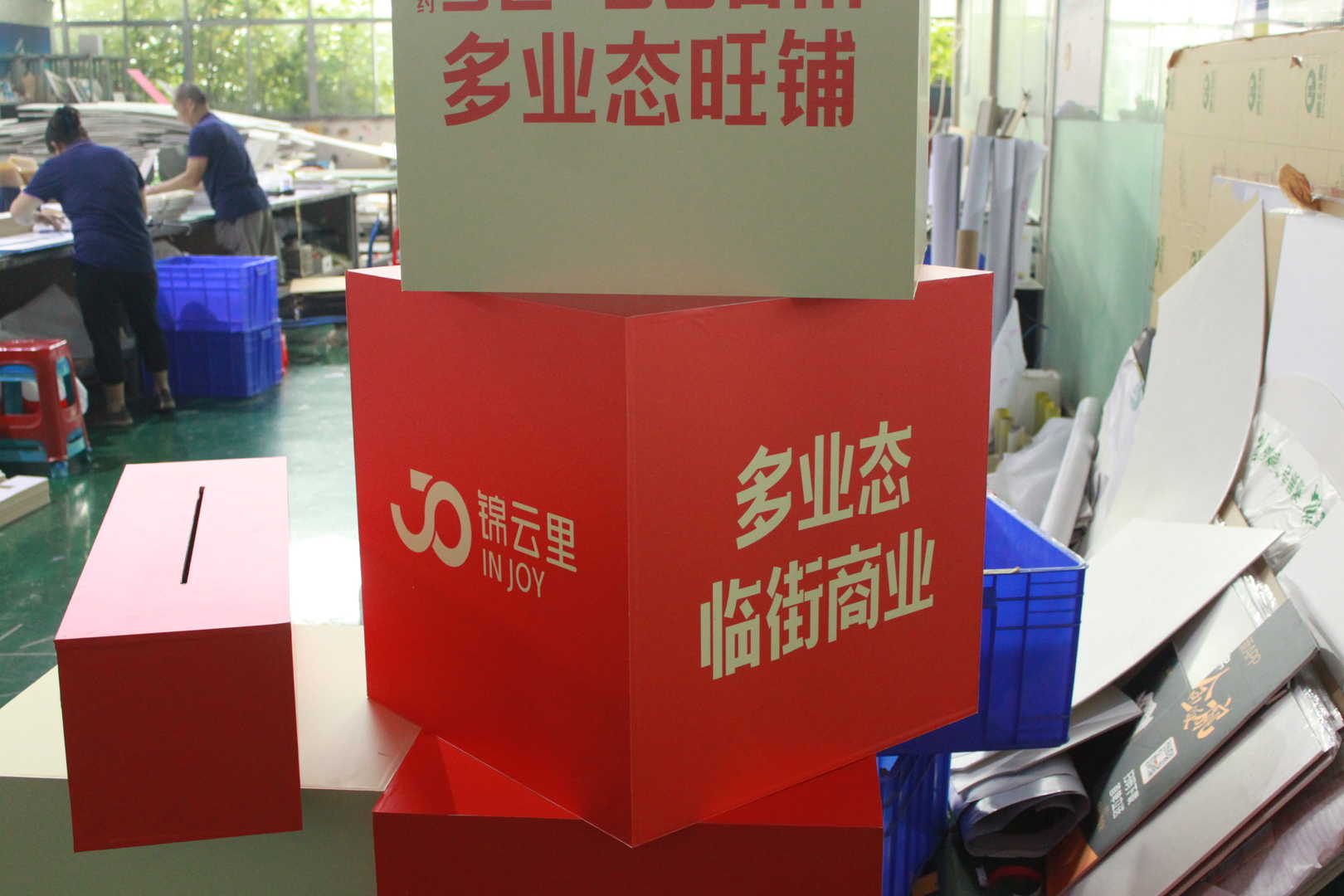 這次錦云里旺鋪商業(yè)街銷售營銷廣告盒子制作,采用了PVC材質(zhì)背膠裱板的制作工藝而成,最后按尺寸切割粘貼合成現(xiàn)在的正方形盒子樣式。