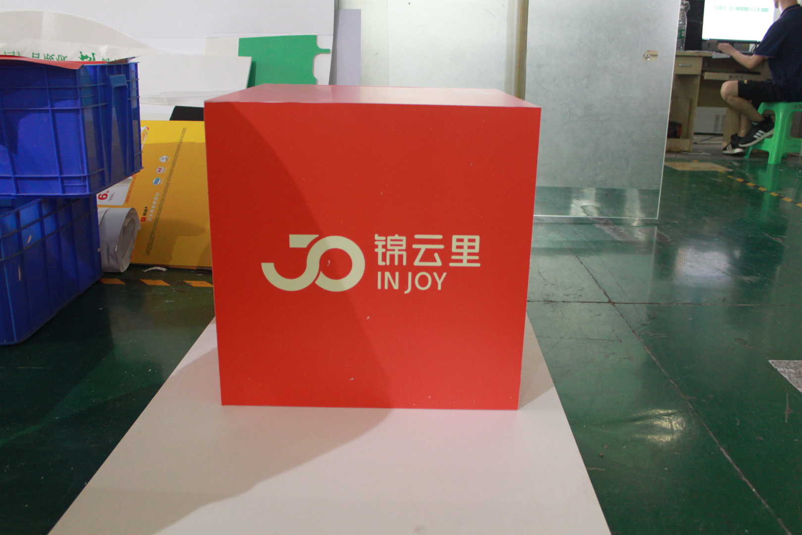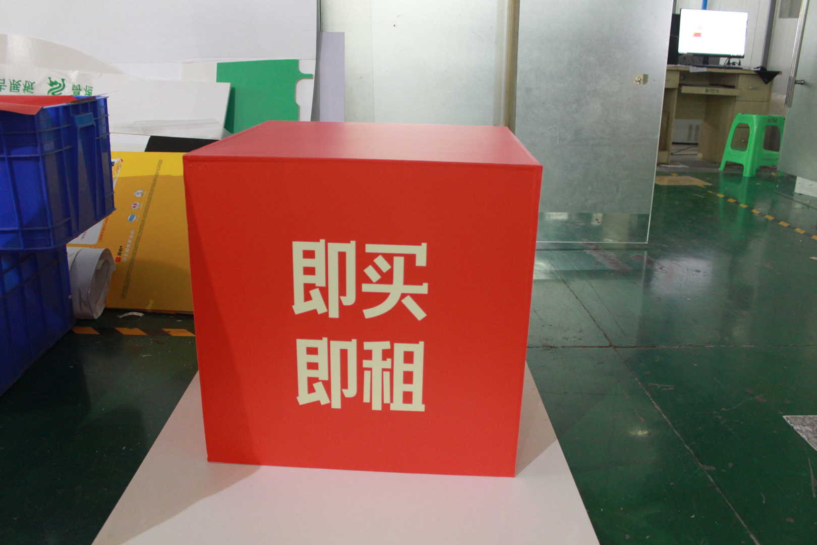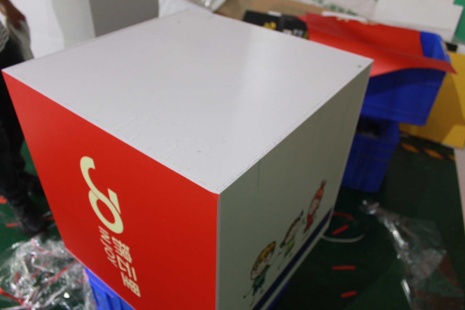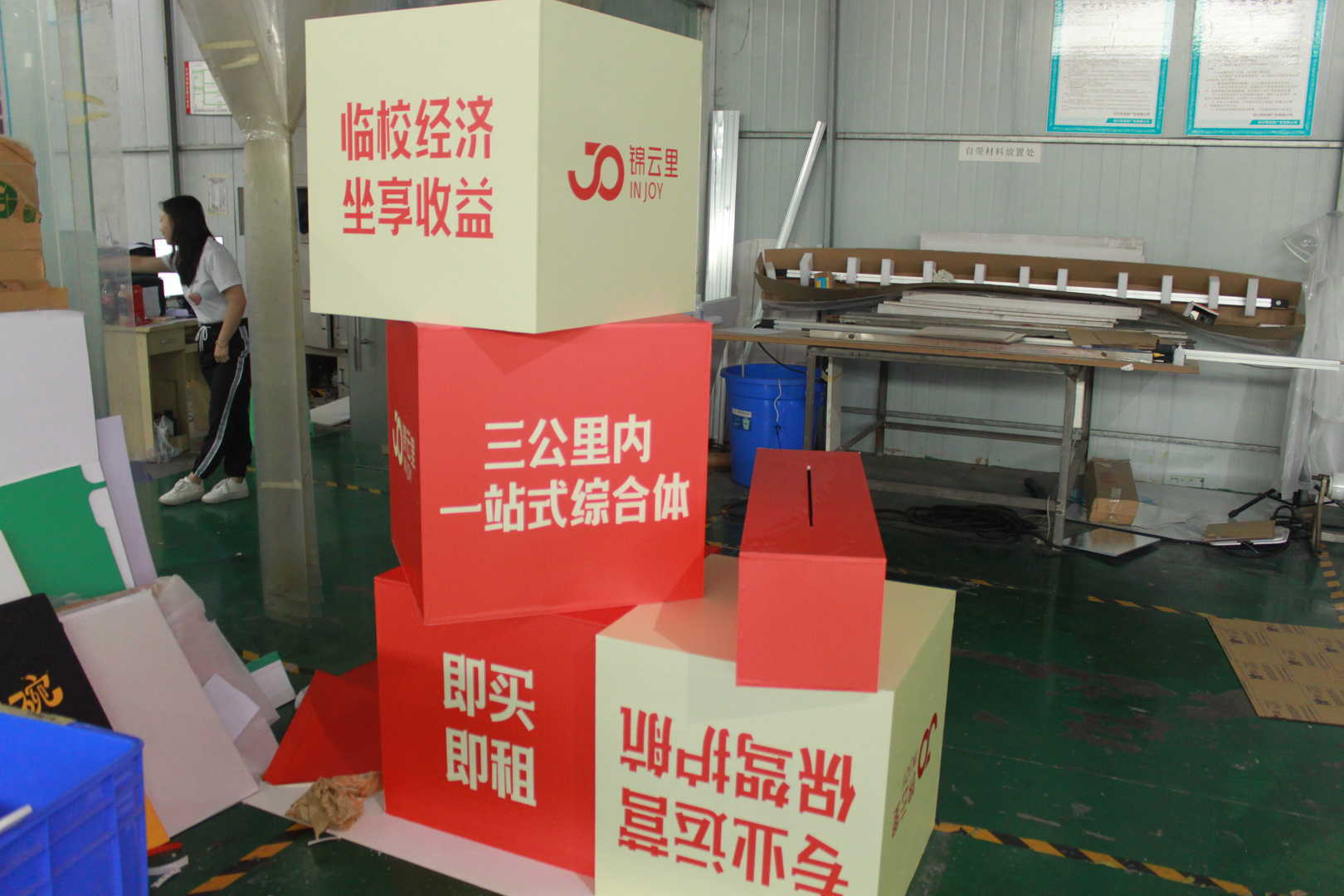 這次錦云里旺鋪商業(yè)街銷售營銷廣告盒子制作,采用了PVC材質(zhì)背膠裱板的制作工藝而成,最后按尺寸切割粘貼合成現(xiàn)在的正方形盒子樣式。