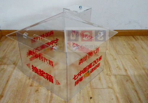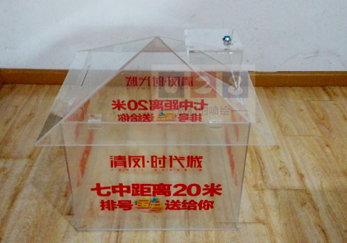 房地產(chǎn)抽獎(jiǎng)箱制作 亞克力抽獎(jiǎng)箱將亞克力雕刻形狀進(jìn)行絲印,然后將各個(gè)亞克力用粘結(jié)劑粘結(jié)成型??芍谱鞒龈鞣N不規(guī)則立體圖形。