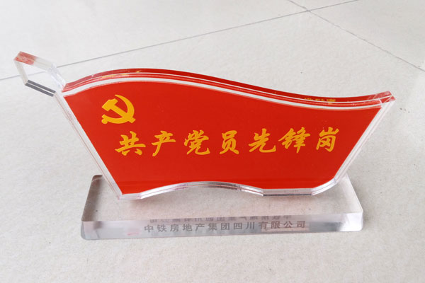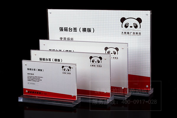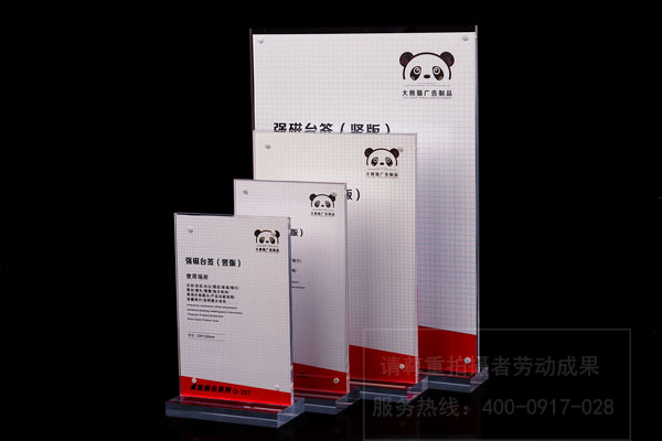 常見的臺簽多是亞克力做的,亞克力折彎造型,雙層,內(nèi)有插槽,可隨時更換內(nèi)容。也有的為了突出品質(zhì),采用亞克力背面絲印,背面烤漆,然后熱彎的工藝。由于亞克力的質(zhì)感比較強烈,光澤度較高,觀感較好,能很好地突出品質(zhì)感,所以采用亞克力制作的臺簽最多見。除了亞克力,有些臺簽是用鋁型材制作,這種臺簽比較便宜,使用也比較方便,但是檔次看起來要差一些。