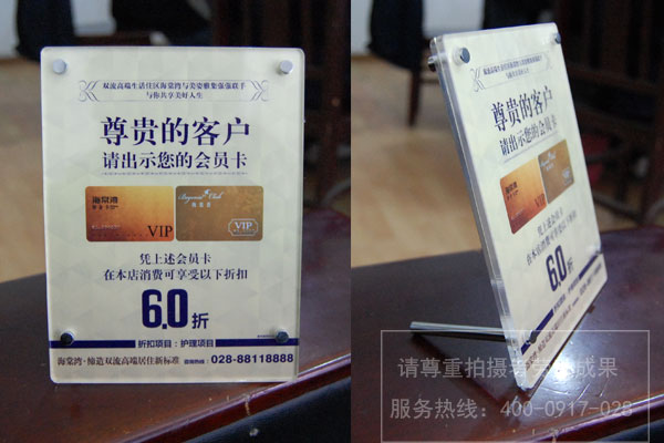 成都亞克力桌牌臺卡席卡制作 桌牌又稱臺簽,是指立在桌面上的標(biāo)識牌,用于展示或提示甲方的信息。臺簽上的內(nèi)容可以是甲方的簡介,也可以是甲方提供的服務(wù)項目,如“服務(wù)臺”、菜單等。還可以指明甲方當(dāng)前所處的狀態(tài),如“暫停售票”等。桌牌(臺簽)的尺寸: 臺簽一般都比較小,寬度一般都在25公分以內(nèi),有橫版的和豎版的,下方有底座或有支撐架,以保證臺簽?zāi)苤绷ⅰ?/strong>