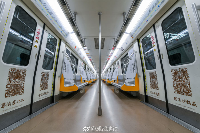 步入成都地鐵“法治號(hào)”主題列車(chē)車(chē)廂,地鐵車(chē)門(mén)處以中國(guó)非物質(zhì)文化遺產(chǎn)——剪紙創(chuàng)作的門(mén)神,分列車(chē)門(mén)兩邊,生動(dòng)詮釋了“法治守護(hù)每一扇通往幸福的大門(mén)”的深刻含義,讓市民乘客真正理解“尊法享公正,學(xué)法講秩序”、“守法不越界,用法護(hù)權(quán)益”的法治精神。而在列車(chē)座位處,“無(wú)論你身居何位,法律面前人人平等”“尊老愛(ài)幼守秩序,法治成都更文明”等宣傳貼畫(huà),一語(yǔ)點(diǎn)破法治要義,號(hào)召市民共同維護(hù)法治文化氛圍。