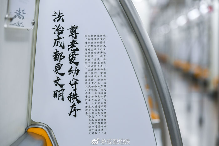 “法治號(hào)”主題列車(chē)以“踐行黨的十九大精神,法治成都讓生活更美好”為主旨,多維度進(jìn)行創(chuàng)意訴求,生動(dòng)詮釋“法治成都”與市民生活的關(guān)系以及帶給市民的切身利益,倡導(dǎo)每個(gè)市民“尊法、學(xué)法、守法、用法”,共同維護(hù)良好的法治文化氛圍。
