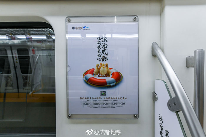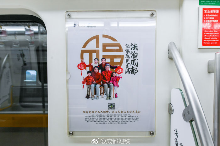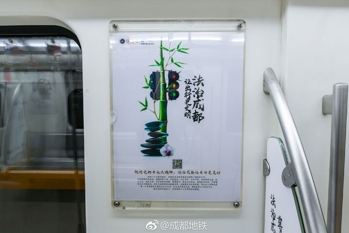 列車(chē)車(chē)廂首先映入眼簾的是一幅幅簡(jiǎn)潔明快的創(chuàng)意海報(bào):以竹子隱喻做君子守法,紅綠燈寓意出行,詮釋“法治成都,讓出行更文明” ;用美滿的家庭、溫暖的笑臉、“?!弊譃樵兀忈尅胺ㄖ纬啥?,讓家庭更美滿”;以竹子做成的傘為國(guó)寶大熊貓遮風(fēng)擋雨,讓大熊貓健康成長(zhǎng),巧妙詮釋“法治成都,讓環(huán)境更秀美”的內(nèi)涵,以入腦入心的方式向市民乘客傳遞法治與民生息息相關(guān),法治就在身邊的觀念。