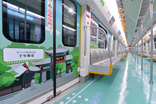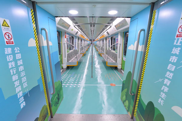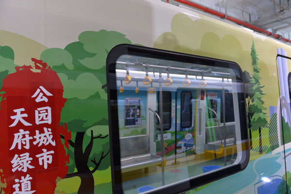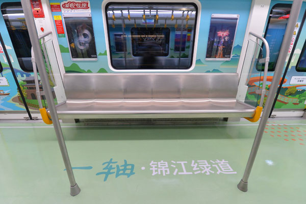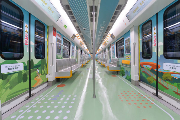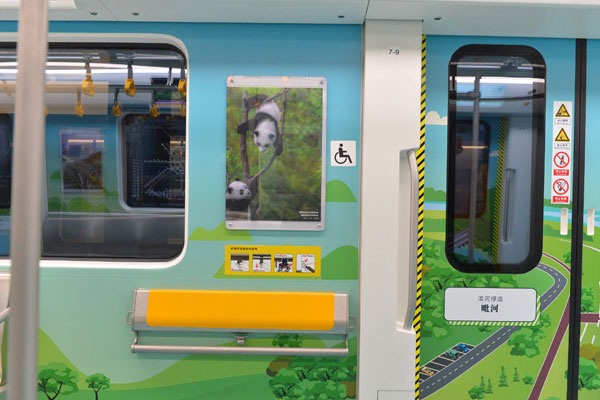 成都地鐵9號線主題列車來了!圍繞“一軸”、“兩山”、“三環(huán)”、“七道”4大主題,成都軌道交通9號線主題列車以8節(jié)車廂為舞臺,全景式地描繪了成都美麗宜居公園城市的建設愿景。每節(jié)車廂分別用“金絲猴、華南虎、大熊貓、金錢豹”作為重要特色標志,充滿新意、奇趣。
