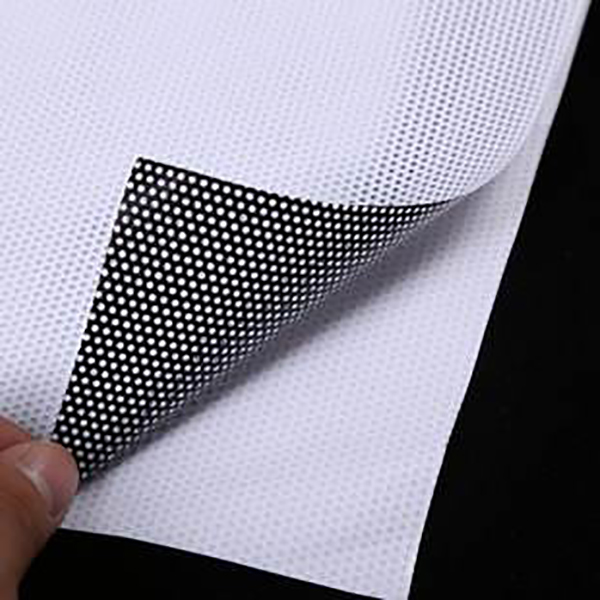 一般,我們常見的公交車外身上張貼一種帶孔的噴繪布是什么材料呢?這種噴繪布材料叫做單孔透,也可以稱作單透貼等名稱。這類材料制作的噴繪布,正面可以使用大型的噴繪機(jī)噴繪出任何的設(shè)計圖案,但是只能單面噴繪,而它的背面則是一種帶膠的材料,能夠粘貼在玻璃、櫥窗、車身等地方。